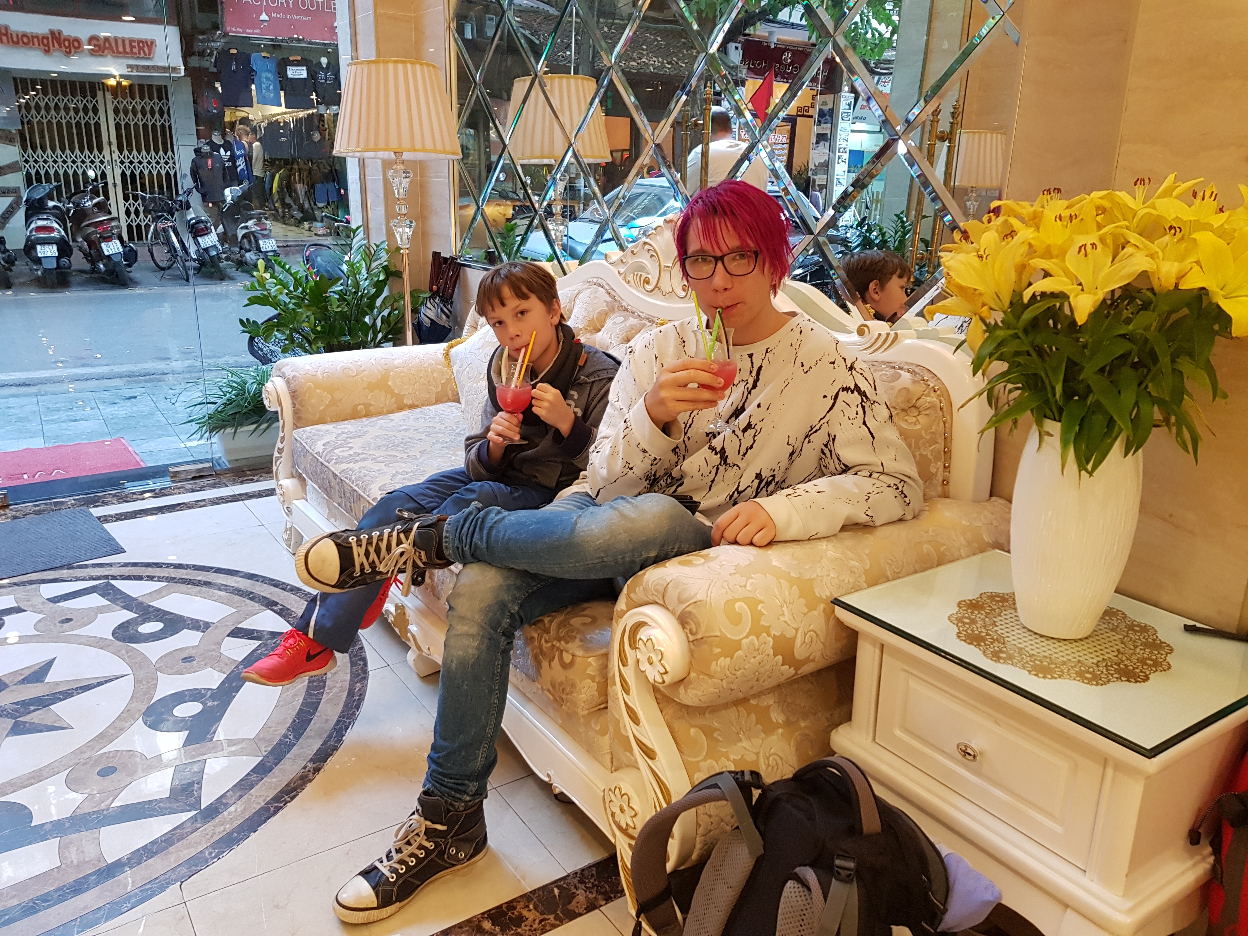 Wir übernachten eine Nacht im Hotel Diamond King, sehr nett und mit Begrüßungscocktail. Zur Info: Wir bezahlen 46 Euro für zwei Zimmer inklusive richtig gutem Frühstück. Wir sind mittendrin. In der Altstadt. Im chaotischen Hanoi. Kein Vergleich zu Tokyo. Es ist dreckig, laut und stinkt. Aber es ist cool. Die Empfangsdame fragt, ob wir schon mal in Hanoi waren. Wir sagen nein. Sie fragt ja nicht, ob wir schon mal in Vietnam waren. Wir bekommen ein Merkblatt. DinA4 beidseits beschrieben. Sie macht uns total Angst. Wir sollen alles im Hotel lassen. Bloß keine Wertsachen, keinen Schmuck, kein Handy, keine Kamera, auf keinen Fall unsere Pässe (die behält sie vorsichtshalber in der Rezeption), keine Kinder,….wird alles geklaut. Organhandel usw…Der Verkehr sei sehr gefährlich, am besten sollen wir nicht über die Straße gehen. Sie empfiehlt uns den Besuch einer christlichen Kirche für morgen, es sei ja ein besonderer Tag. Angepisst ist sie, als wir daraufhin sagen, ja, wir machen eine Tour durch die Halongbucht auf einem tollen Schiff. Sie meinte natürlich Allerheiligen, trägt ein fettes Kreuz um den Hals und versteht uns nicht, als wir ihr erklären, dass wir gar nicht so sind. Spirituell unabhängig sozusagen. Gibtˋs hier nicht (kein entsprechendes Modul im Hirn vorhanden), jeder muss glauben, notfalls an Drachen oder Geister. Wir trauen uns raus, aber nur nach nebenan in ein hübsches, teures Touristenrestaurant voller bunter Laternen. Leider konnten wir keine Fotos machen, weil wir ja nichts dabei hatten. Die Kinder können hier auf keinen Fall alleine los. Viel zu gefährlich. In Tokyo (9,6 Mio Einwohner) ging das, sogar alleine Ubahn fahren. Hier in Hanoi (4 Mio Einwohner) geht das nicht. Mike und Bela gehen ins Bett. Dort ist es sicher. Fußmassage nach dem Essen gibt es gegenüber vom Hotel (wir schaffen es zum Glück dann doch lebend über die Straße) in einem Laden mit wenig bis gar keinem Feng Shui. Vier Kleinkinder zanken sich im Massageraum, meine Masseurin wechselt zwischendurch, die Sessel sind nicht sonderlich bequem und ein Schnäppchen ist es auch nicht unbedingt. Aber immerhin im Dunstkreis des Hoteleingangs…Wir trauen uns nach der Massage in einen Supermarkt, um Wasser zu kaufen. Dafür müssen wir wieder die Straße überqueren. Sind also glücklicherweise jetzt auf unserer Seite. Dummerweise findet Levi einen Pulli in einem Laden neben der Massage ( den er für den Rest der Reise nicht mehr auszieht). Also wieder über die Straße. Diese Straße ist übrigens ungefähr so breit wie die Zufahrt zu unserem Grundstück… Den Pulli möchte ich mit Kreditkarte bezahlen. Levi holt mein Portemonnaie aus dem Hotel und schafft es ohne meine Hilfe erneut über die Straße. Sogar zweimal, denn zurück ins Geschäft muss er ja mit meinen Sachen auch noch. Auf einmal steht Bela auch im Geschäft. Er hat gewartet, bis Mike eingeschlafen ist, hat sich rausgeschlichen und ist Levi gefolgt. Mir bleibt fast das Herz stehen. Wie konnte er unbeschadet das Hotel verlassen und es über die Straße schaffen? Alleine? Die Empfangsdame hätte das verhindern müssen. Okay zurück zur Kreditkartenzahlung. Die Dame aus dem Pulloverladen sagt, „follow me“ und geht mit meiner Kreditkarte los. Aus dem Geschäft hinaus auf die Straße. Feindgebiet. Unsicheres Terrain. Scheiße…ich flitze hinterher. Sie hat meine Kreditkarte. Sie geht über die Straße, um die Ecke, ich sehe das Hotel nicht mehr. Kalter Schweiß. Sie geht weiter. Mein Puls steigt. Gefühlte 3 KM weiter, 2 Entführungen und 4 Überfällen später, mein Blutdruck ist jetzt auch auf einem ordentlichen Level, lande ich nach etwa 150 Metern wohlbehalten in einer Filiale des Pulloverladens. Alles klappt prima. Ich finde sogar unbeschadet wieder zurück. Ich gucke sogar ein bisschen nach rechts und links. Dabei finde ich heraus, dass wir hier viel günstiger hätten essen können. Gut, wir kommen ja nach der Bootsfahrt wieder, Wir bummeln jetzt alle in unterschiedliche Richtungen. Es geht gut. Es macht Spaß. Wir entdecken einiges.