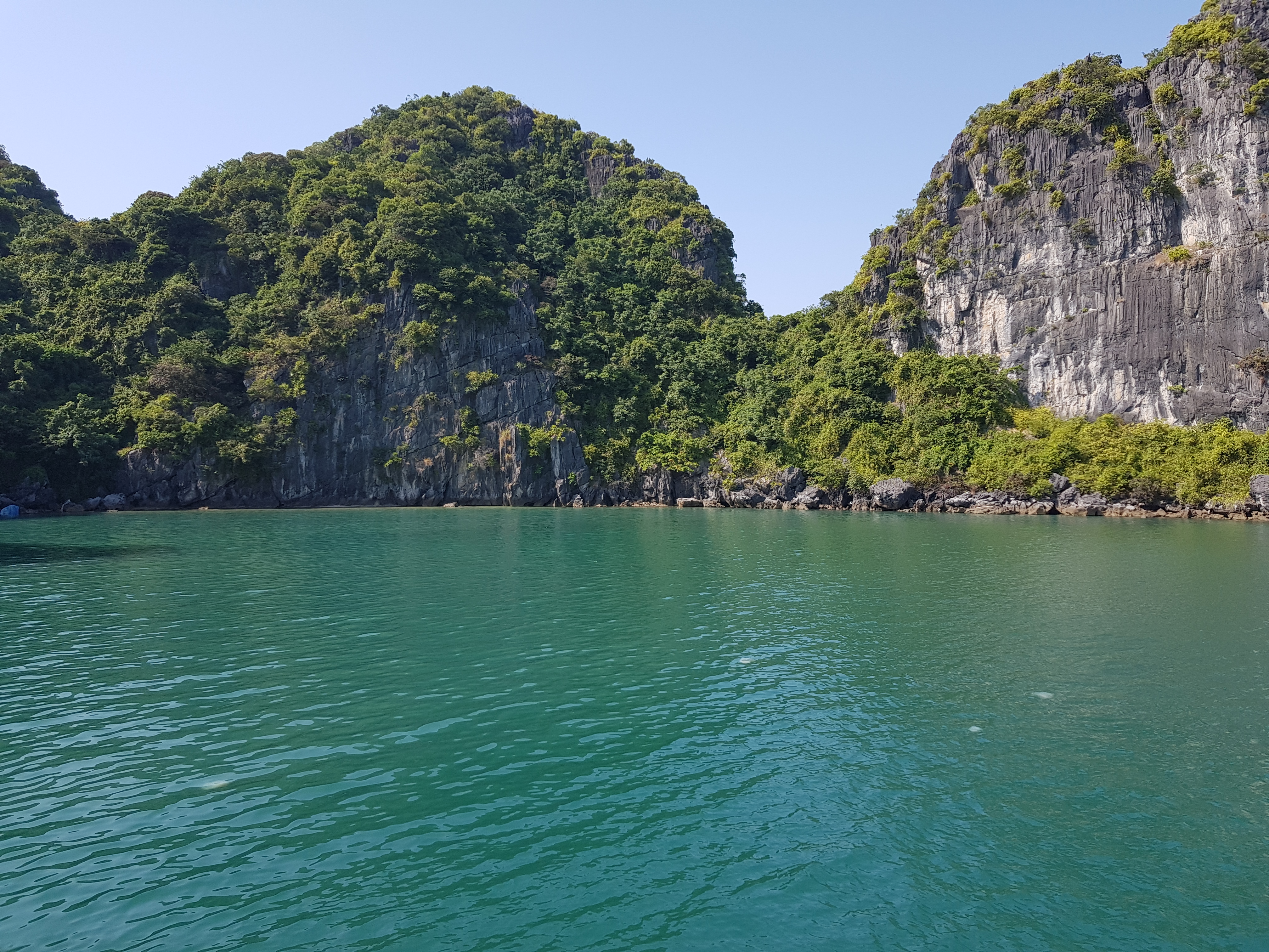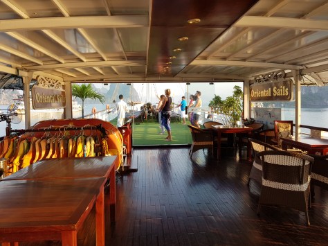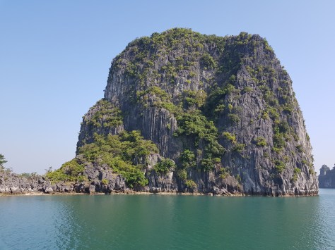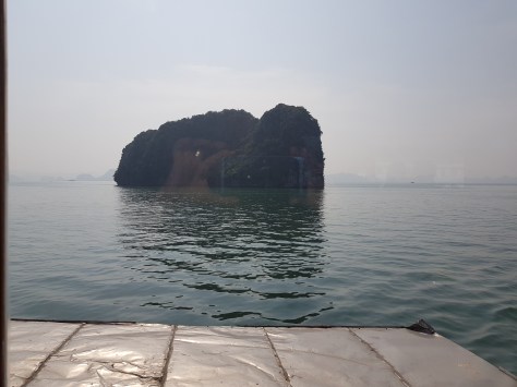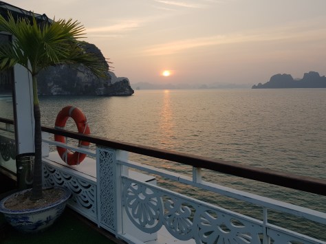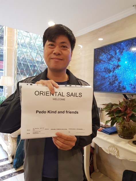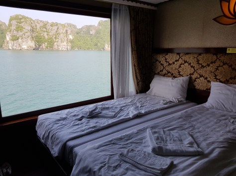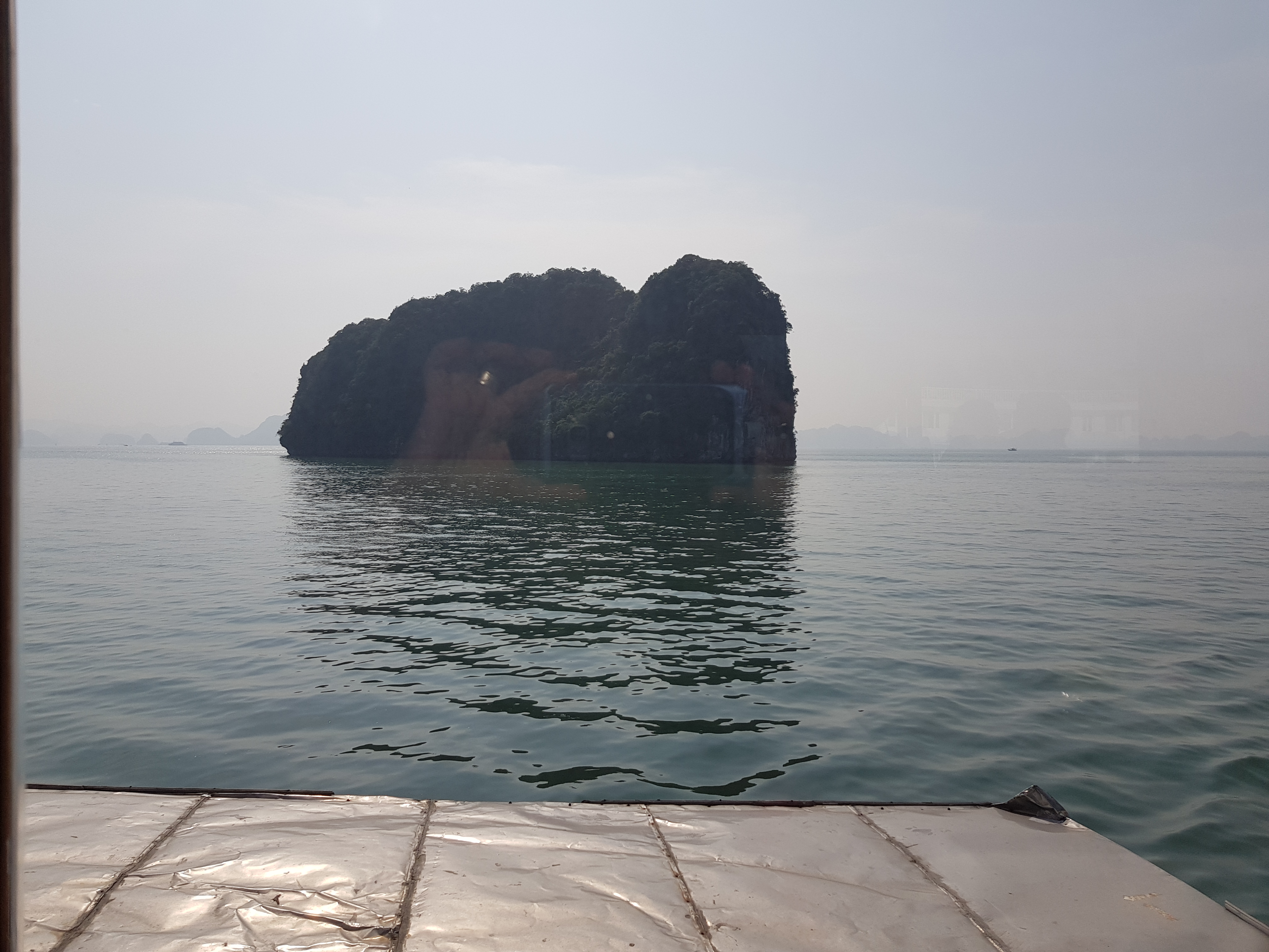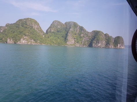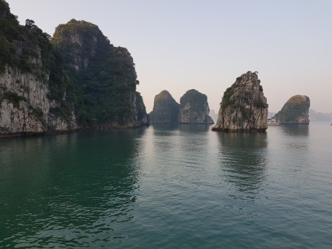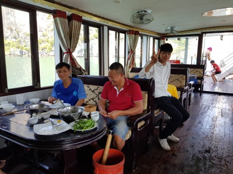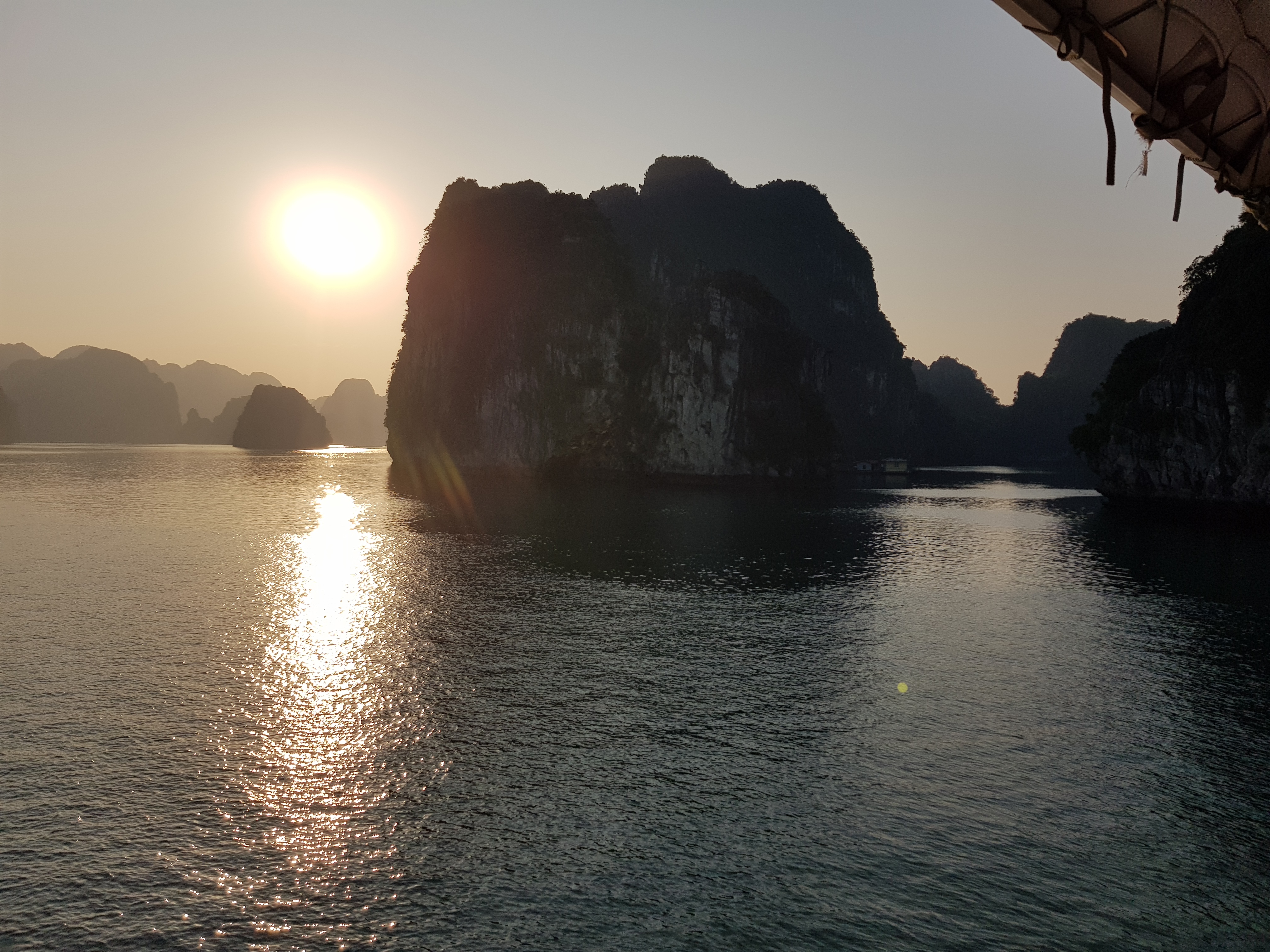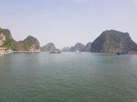Über die Fahrt habe ich ja bereits oben geschrieben. Unser Guide (Jackie, wie Jackie Chan) erklärt auf der Fahrt unheimlich viel. Auch viel Stuß, den wir gar nicht hören wollen. Immer komische Witze mittendrin, die auf keinen Fall einstudiert wirken;) Er ist ein typischer vietnamesischer Reiseleiter, wir kennen das noch vom letzten Mal. Sie erzählen sehr viel, ohne dabei etwas zu sagen. Sie haben 12 Monate Ausbildung, davon 9 Monate Training, wie sie auf unbequeme Fragen nicht antworten. Sie sind den Amerikanern so dankbar, dass sie da waren…Hab ich mich verhört? Ich bin in Nordvietnam! Wo die dritte und vierte Generation sogar bereits im Kindergarten fertig gemacht wird, wenn der Opa mit dem Süden mit den Amerikanern gegen den Norden gekämpft hat. Wo man als Südvietnamese keinen Fuß auf den Boden bekommt, keine Ämter im Öffentlichen Dienst beispielsweise…. Wir landen am Hafen, checken auf dem Schiff ein und freuen uns auf drei Tage und zwei Nächte auf der Oriental Sails durch die Halongbucht. Sie gehört zum Unesco Weltnaturerbe. Zu Recht, wie wir finden. Hoffentlich wird das auch den Vietnamesen bald klar, denn so verdreckt wie die Bucht teilweise ist, wird es nicht mehr lange dauern und dieser Status wird aberkannt. Es gibt hier sehr viele Schiffe und wir schippern nur durch den rihgen Teil der Bucht. Der Hauptverkehr ist in der großen Bucht, dort sind täglich 500 Schiffe unterwegs. Mit entsprechend Abfall. Unser Boot hat Abwassertanks und ausreichend Platz für Abfall. Diese Tanks werden gewogen und wenn die geschätzen Mengen nicht stimmen, gibt es eine Geldstrafe. So könnte es funktionieren, wenn alle mitmachen würden. Die asiatische Sichtweise ist leider eine andere. So mussten auch auf „Befehl“ irgendeines Ministers alle Boote innerhlab von 6 Wochen weiß gestrichen werden, weil besagter Mann in Frankreich an einem See lauter weiße Schiffe gesehen hat und begeistert war. Das bedeutete, die schönen braungoldenen Schiffe mit aufwendigen Schnitzereien gibt es nicht mehr. Alles weiß, Schnitzereien sieht man nicht mehr…