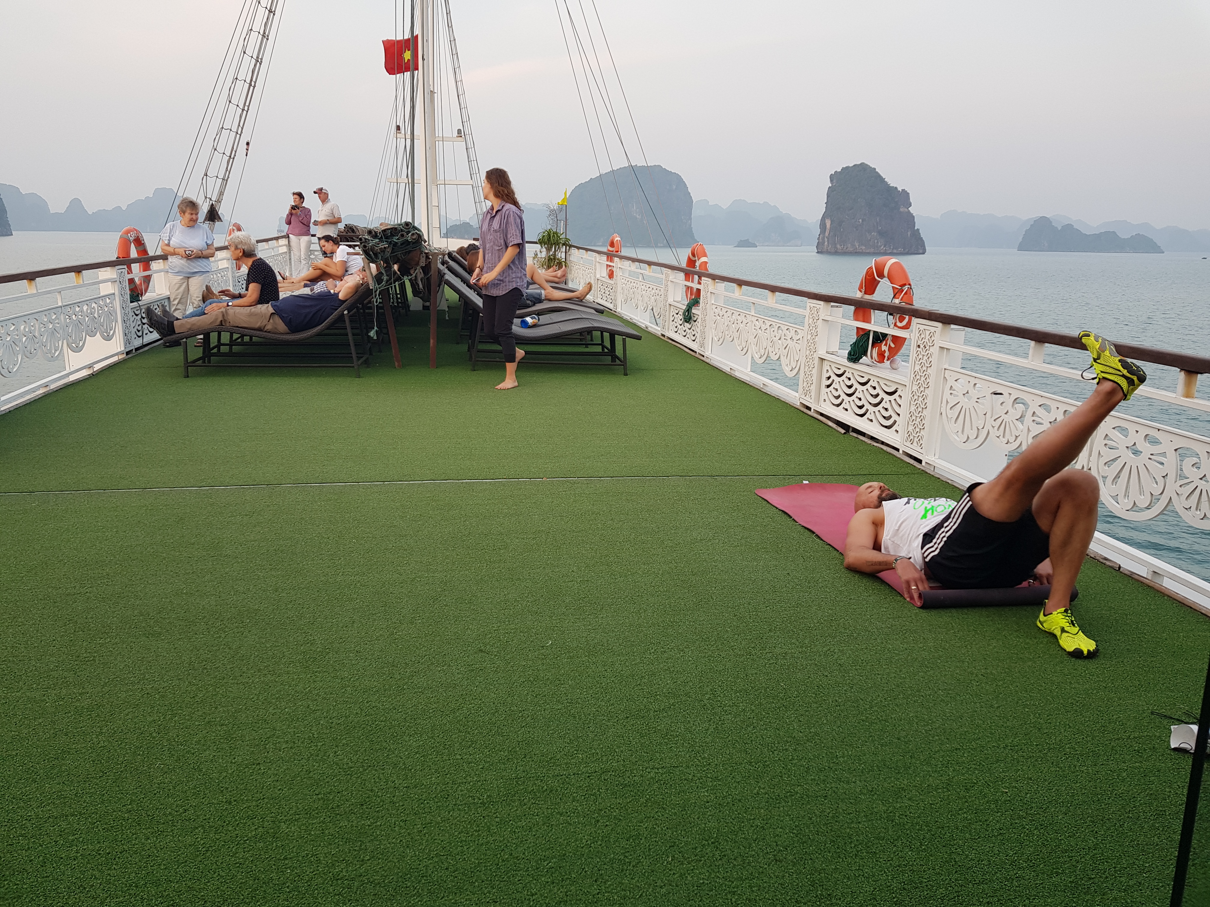 Am Abend ist Karaoke bis die Heide wackelt. Azul und unser neuer Kumpel aus Holland singen, was das Zeug hält. Macarena und Barbie Girl und so weiter. Bela lacht sich schlapp und kommt alle 10 Minuten kichernd in unsere Kabine. Irgendwann können wir einschlafen. Am nächsten Morgen wird noch eine Höhle angeschaut und um 10.30 Uhr Mittag gegessen. Damit toppen wir meine Schwiegereltern um mindestens 45 Minuten 😉 Auschecken und ab gehtˋs zurück nach Hanoi. Der Rückweg ist genau wie der Hinweg, der Fahrer hat es eilig, ich überlege, ob ich etwas sage…da er es im Griff zu haben scheint, halt ich die Klappe. Wir stoppen auf der Hälfte, sollen Kunsthandwerk kaufen, für das wir keinen Platz haben und essen Ananas mit Chili und Salz. Auf der Weiterfahrt nach Hanoi kommen wir an einem wirklich (für uns) dramatischen Unfall vorbei. Levi kann Bela gerade noch rechtzeitig die Augen zuhalten. Uns wird richtig schlecht und wir schweigen erstmal für eine lange Weile. Der Fahrer reduziert sein Tempo, obwohl er und auch der Guide recht unbeteiligt wirken. Das gehört hier offenbar zum Alltag. Wir kommen heil an und checken schnell ein, kennen ja noch alles, auch unsere Daten haben sie noch. Netterweise konnten wir unser Gepäck im Hotel lassen, so dass wir nur Handgepäck mit auf das Schiff nehmen brauchten. Mike und ich haben ein Zimmerupgrade bekommen in die Suite! Mit Balkon zur Strasse. Toll! Heute ist Freitag! Wochenende! Seit Oktober wird die Altstadt am Wochenende für Autos gesperrt und zur Partymeile. Überall Bands und feiernde Menschen. Das ist nur solange schön, wie man mitmacht. Aber wenn man dann müde ins Bett fällt, ist es schon nicht mehr so schön, wenn direkt unter dem Upgradebalkon eine Gruppe Tempelvorführungen veranstaltet. Natürlich in asiatischer Lautstärke….Aber wir wissen ja schon vom Karaokeabend, dass man trotzdem einschlafen kann, wenn man nur müde genug ist. Müde sind wir abends immer. Obwohl wir heute noch bis 23 Uhr und ein paar Bier durchgehalten haben. Wir waren erst „local“ essen und noch ein bisschen bummeln, inkl. Fussmassage.