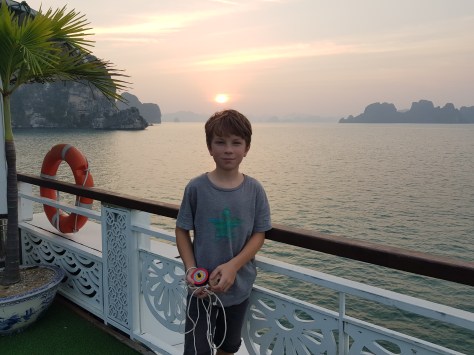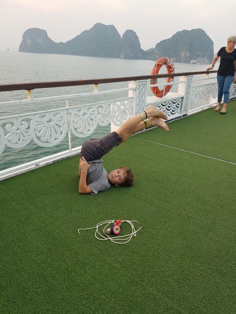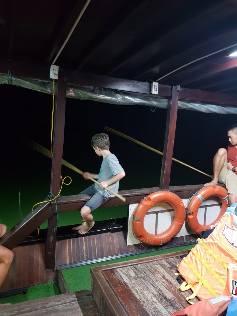 Wir fahren durch die wunderschöne Wasserlandschaft zurück zu unserem Hauptboot. Es war ein wirklich schöner Tag. Bei Bela kam auch ziemlich bald die gute Laune zurück. Wir haben noch ein paar erlebnisreiche Tage in Vietnam vor uns, aber danach haben wir erstmal ein Haus in Auckland gemietet, um ein bisschen zur Ruhe kommen zu können und die Eindrücke zu verarbeiten. Das geht uns Erwachsenen ja auch nicht anders. Und dort in Auckland im Haus gibt es, und das schwöre ich, keine Nudelsuppe!!