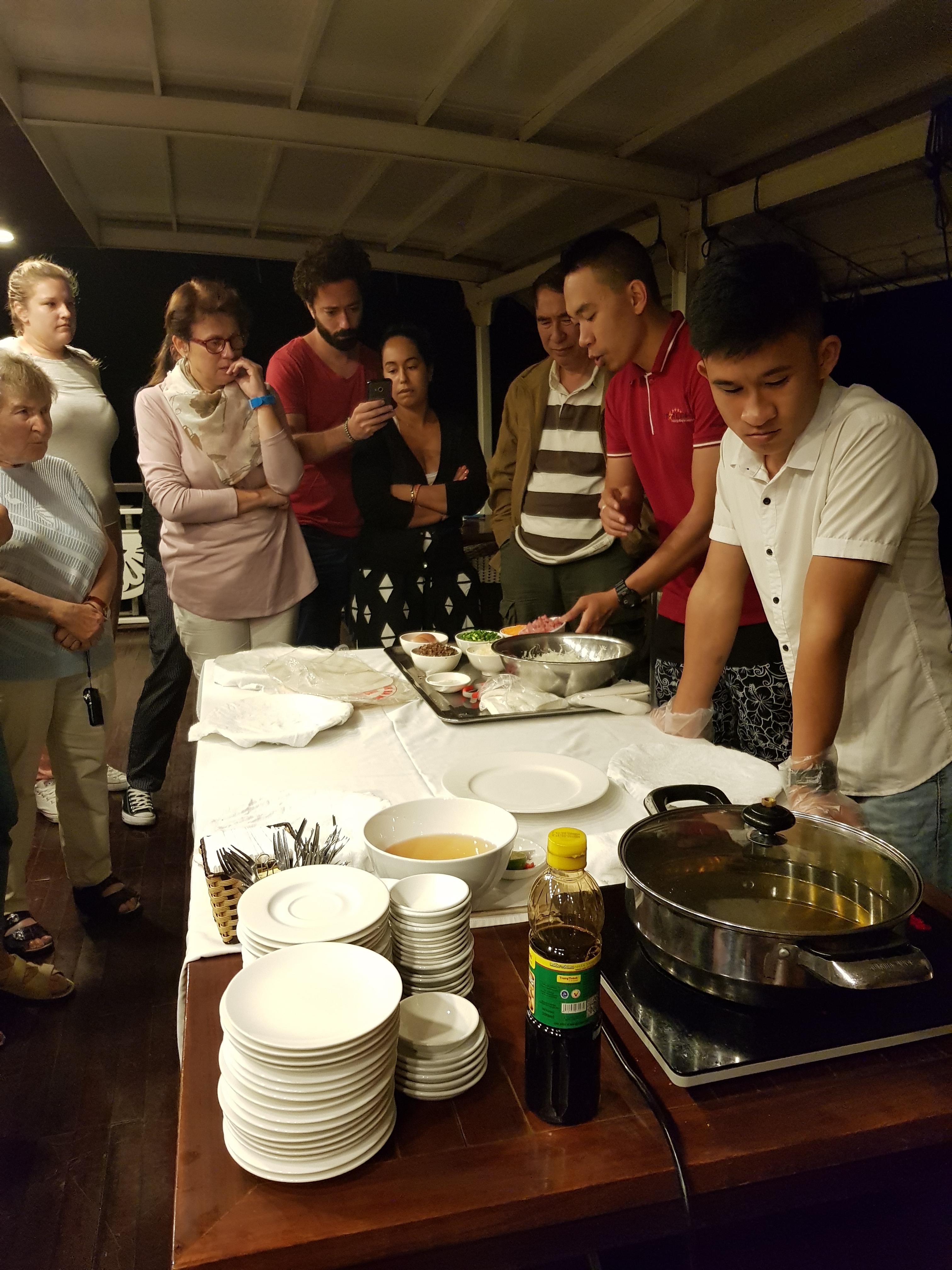 Happy hour ist von 17 bis 19 Uhr, es gibt 3 für 2. Also rein damit. Mike erntet bewundernde Blicke. Bela natürlich auch. Am Abend gibt es Kochkurs. Frühlingsrolle, frittiert. Azul macht mit und wir dürfen probieren. Es gibt einen deutschsprechenden vietnamesischen Guide, der den Kochkurs wie folgt ankündigt:“ Zuerst kocken wir, dann kotzen wir später davon“ Wir müssen lachen.