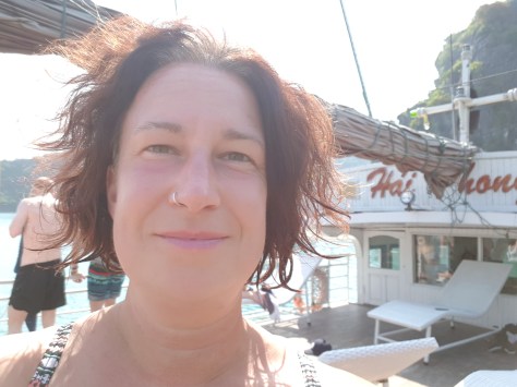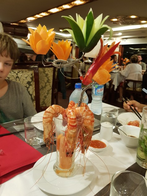 Zurück auf dem Boot, sind wir erstmal fast alleine. Die neuen Passagiere, die nur eine Nacht gebucht haben, machen gerade den Fishing Village Ausflug. Allerdings sitzen zwei Damen auf dem Oberdeck, auf dem wir uns jetzt auch niederlassen. Es gibt Menschen, die gucke ich an und weiß, das ich sie nicht mag. So nimmt das Schicksal seinen Lauf. Es dauert nicht lang, da kommt die eine zu Mike und fragt, ob er Deutsch kann. Und ob er aufhören kann, mit den Beinen zu wackeln. Kann er nicht und er erklärt warum. Sie sagt was von Egoismus und so weiter…Mike wird ungeduldig, schließlich macht er das nicht mit Absicht. Sie sagt, das ganze Schiff wackelt. Das ist echt Quatsch. Sie raucht währenddessen. Das macht sie mit Absicht. Auch das thematisiert Mike. Naja, egal. Frei nach dem Motto: Auf jedem Schiff, das schwimmt und schwabbelt, ist einer drauf der dämlich sabbelt! 😉