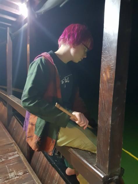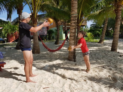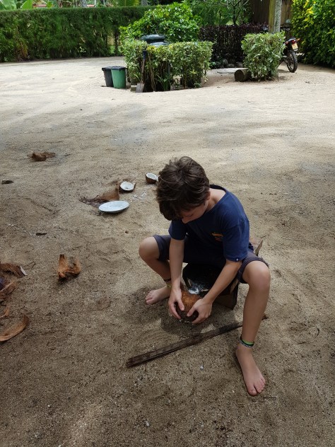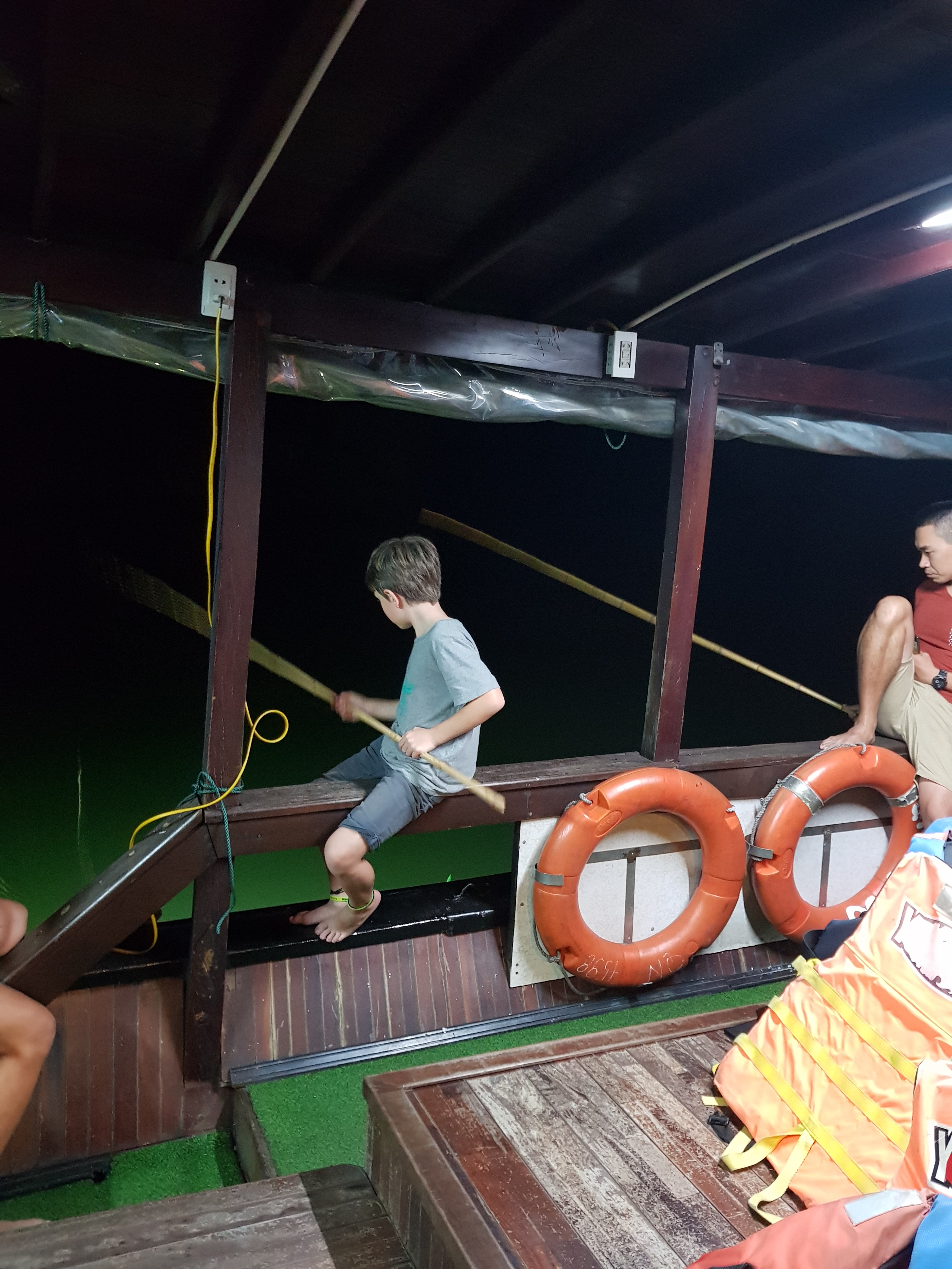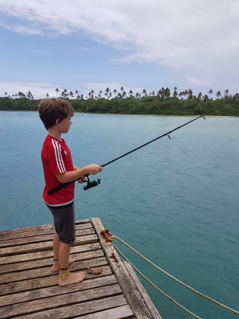 Das Abendessen ist das gleiche wie gestern, wie mit der brennenden Ananas und so weiter. Aber dennoch lecker. Die Jungs verlassen den Tisch früher, haben keinen Hunger und keine Lust auf zweimal das gleiche und gehen Squid Fishing. Wie gestern. Allerdings kommt Bela nach 10 Minuten aufgeregt ins Restaurant und sagt, Levi hat einen geangelt. Tatsächlich baumelt an seiner Angel ein kleiner Tintenfisch. Er wird fotografiert, gekocht und verspeist. Die Jungs sind stolz!