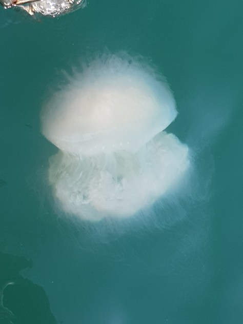 Später können wir vom Boot aus Arschbomben ins Wasser machen. Wir lotsen uns gegenseitig durch die Quallen, so dass niemand zu schaden kommt. Außer den Quallen, weil Bela sie zu angeln versucht.