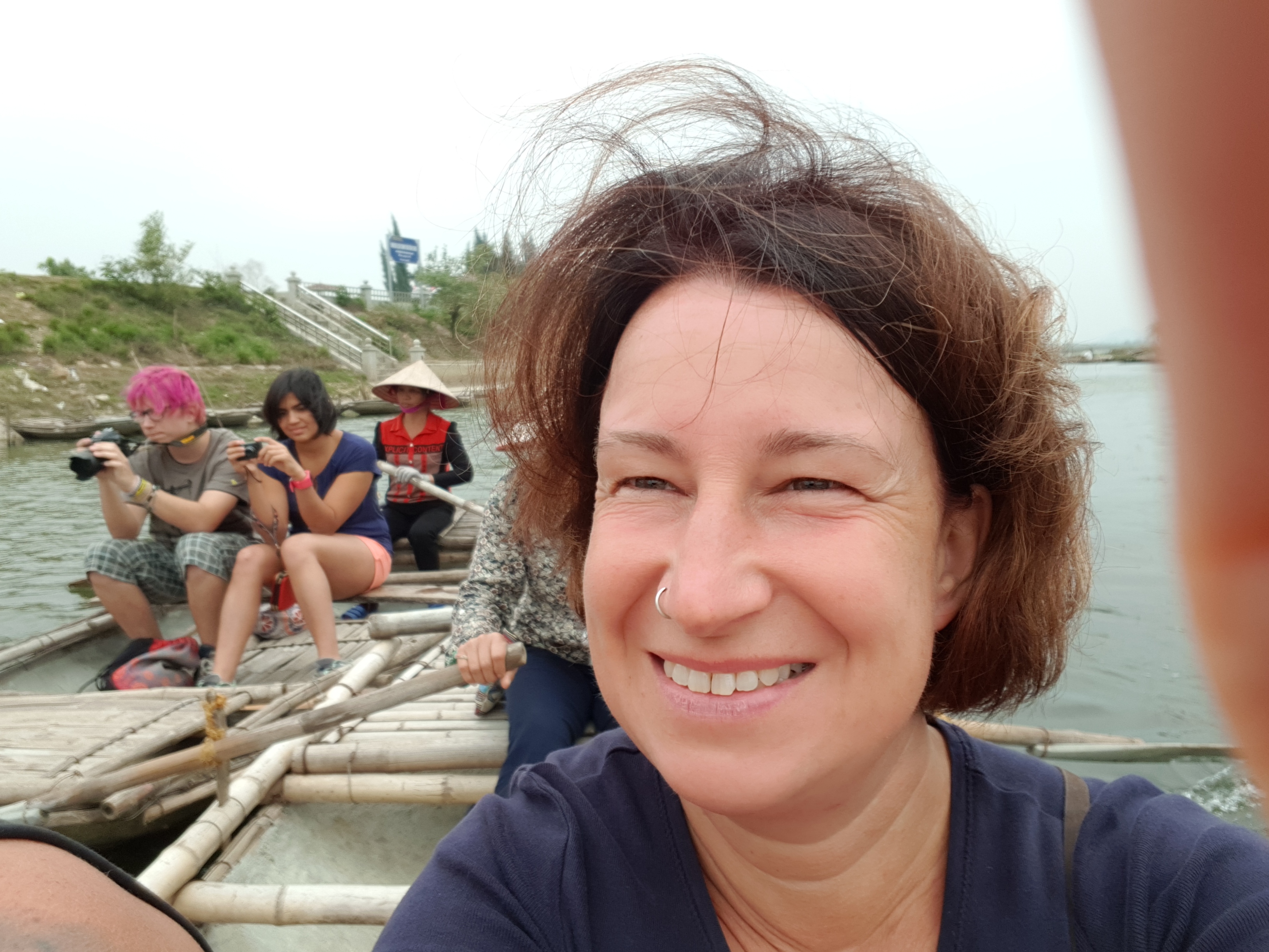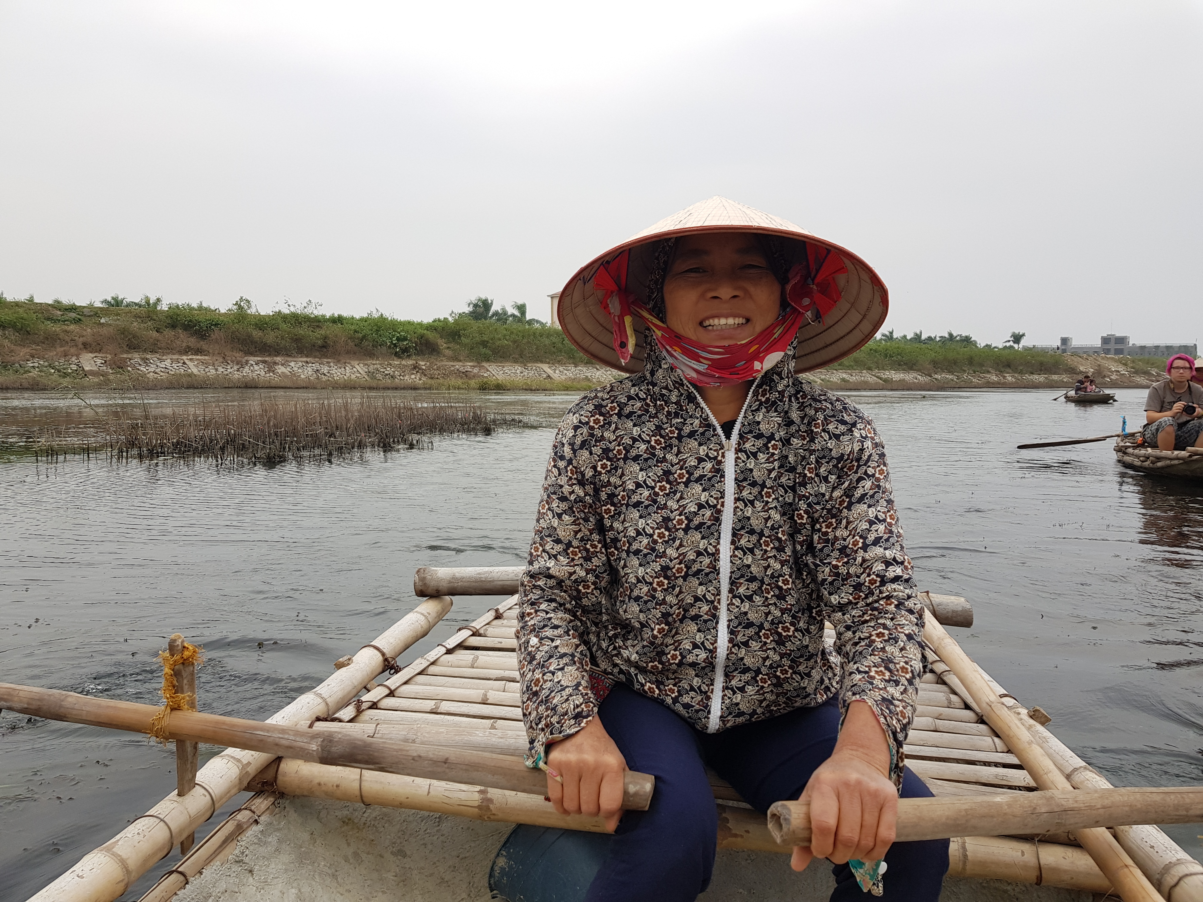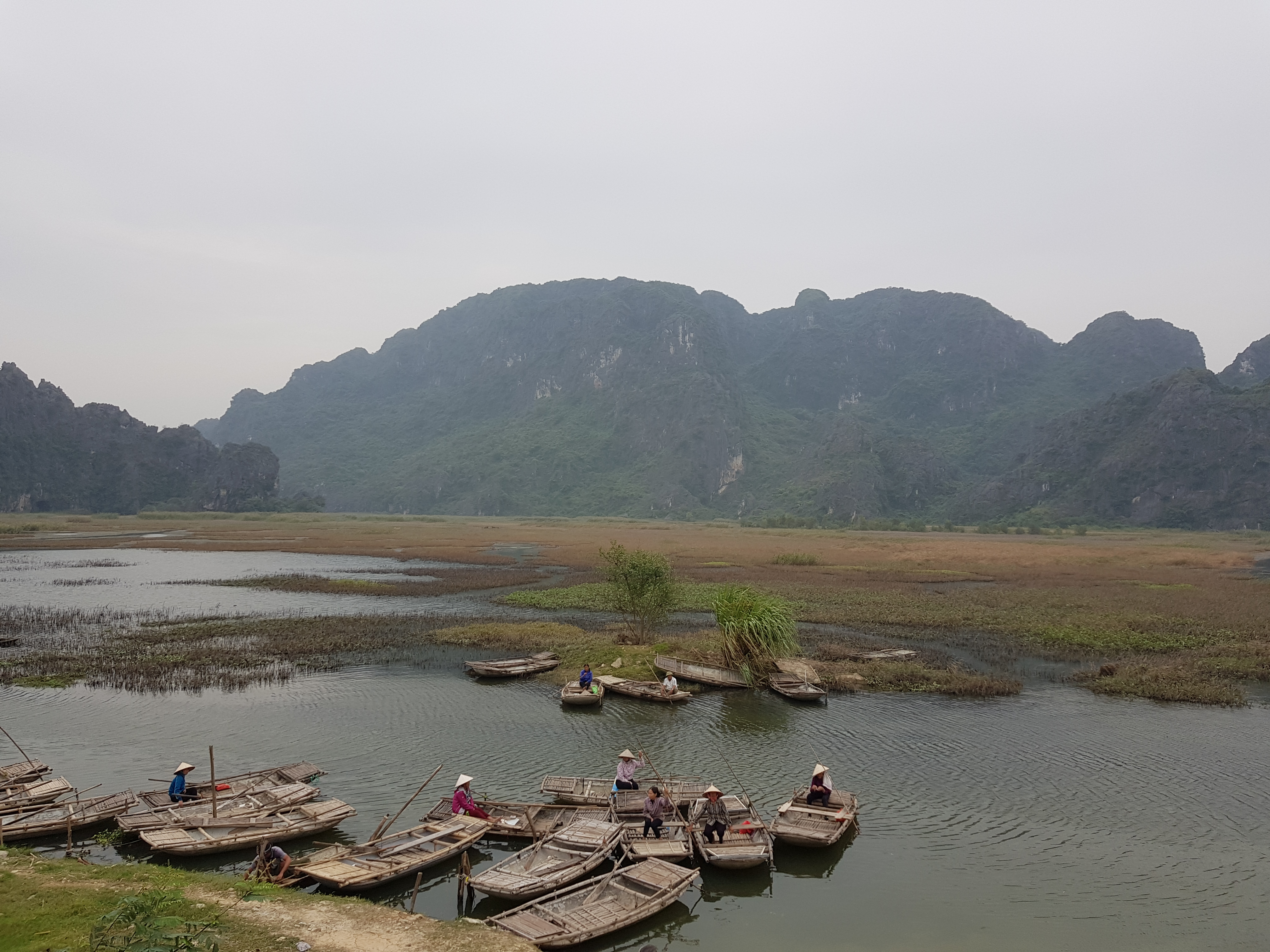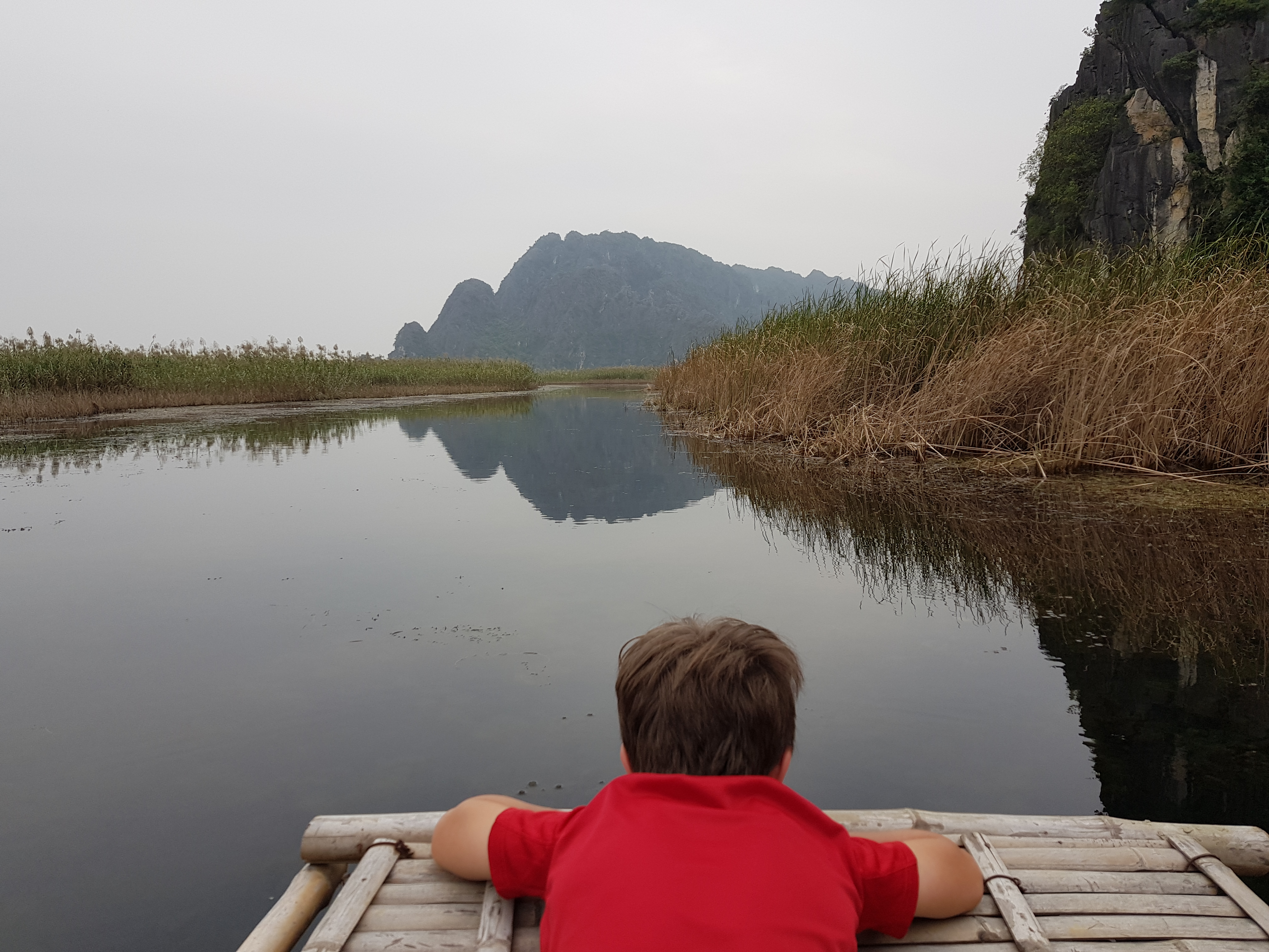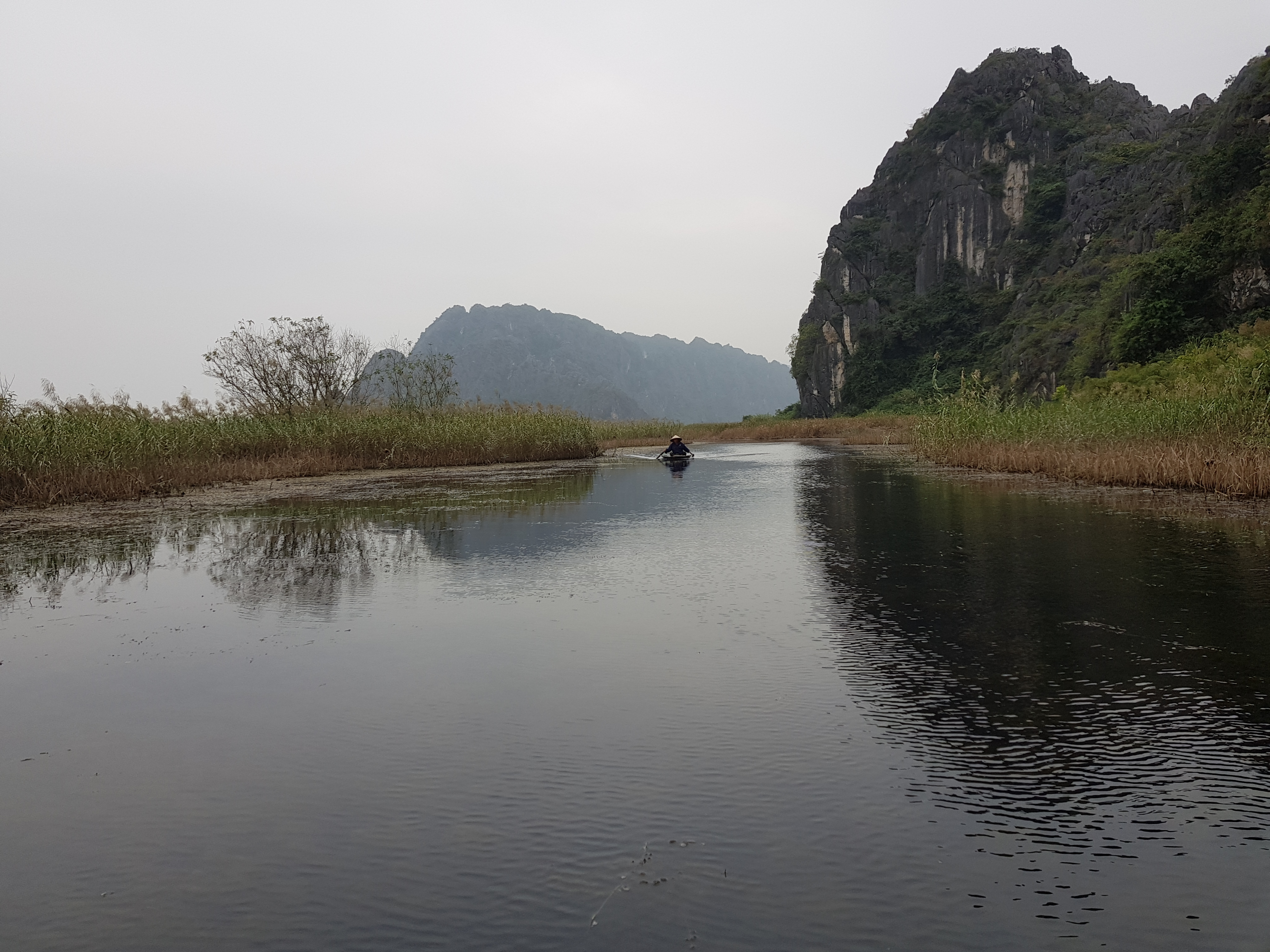 Am nächsten Morgen werden wir von Jürgen Eichhorn abgeholt. Mit ihm machen wir einige Touren hier im Norden. Er lebt seit einigen Jahren hier und bietet Touren abseits der Touristenrouten an. Darauf freuen wir uns gerade sehr, weil wir schon ziemlich viel Touristenkram hier gemacht haben. War alles sehr schön, aber jetzt mal etwas weniger trubelig! Er hat seine Tochter dabei, sie hat heute schulfrei. Ich weiß nicht warum, bis mir nach ein paar Stunden klar wird, es ist Sonntag. Hier hab ich keine Idee, welcher Wochentag ist. Datum weiß ich immer, bin aber ansonsten auf dem besten Weg zur Entschleunigung. Wir fahren in einen Nationalpark südlich von Hanoi – Ninh Binh – Bela und Maya verstehen sich super und rocken die Fahrt. Wir lassen uns mit Bambusbooten durch einen Teil des Nationalparks fahren, sehen aber leider keine Tiere. Vor allem keine Affen, es ist -wie bereits erwähnt- Sonntag und ganz Vietnam ist auf den Beinen. Da nehmen die Affen reißaus. Dennoch ist es hier sehr schön und ruhig, wenn uns nicht gerade eine Horde chinesischer Touristen auf Booten entgegen kommt oder die eine Ruderdame mit Lautsprecher auf dem Handy telefoniert…