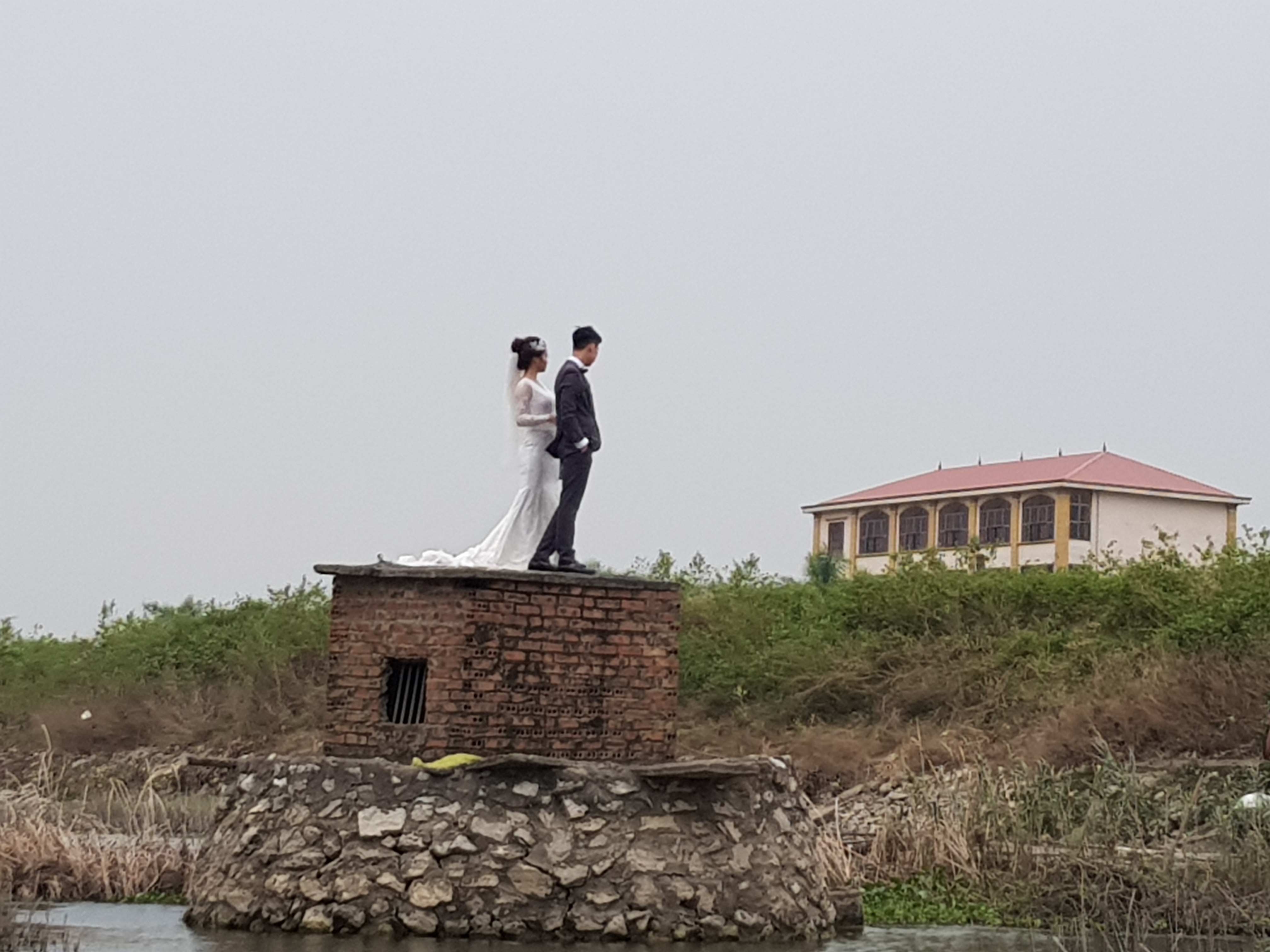 Wir stehen auf der vietnamesischen Seite, die Fälle sind etwas kleiner. Wir brauchen etwas Zeit, um die Fälle auf der chinesischen Seite schön fotografieren zu können, weil zahlreiche chinesische Flösse unterwegs sind, die das Motiv verschandeln. Die Chinesen juckt das gar nicht, sie knipsen drauf los. Auch hier gibt es natürlich wieder einen Markt, sie wollen uns unbedingt etwas verkaufen und laufen hinter uns her, also ab nach Hause. Etwa 17 KM vor dem Ziel kommen wir in einen Stau. Es ist ungefähr 16:30 Uhr. Es hat wohl gegen 12 Uhr einen LKW Unfall gegeben. Nix geht hier mehr. Wir stehen und alle anderen auch. In mehreren Reihen nebeneinander, so dass nur noch die Mopeds durchkommen. Ich denke, dass die auf der anderen Seite des Unfalls auch auf diese Art rumstehen. Das würde bedeuten, wenn frei ist und alle wieder fahren könnten, müsste jemand erstmal die Wartenden entknoten. Ich habe das im Süden schon mal gesehen, als eine Fähre angelegt hat. Auf der Fähre standen alle an der Reling entlang und am Fähranleger standen auch alle in einer langen Reihe. Die Fähre legt an und alle rammeln aneinander. Es werden nicht erst alle runtergelassen, nein, alle versuchen gleichzeitig runter und rauf zu kommen. Ebenso funktioniert das bei Schranken. Sieht lustig aus, oft passiert auch etwas, aber niemand lernt draus. Naja, wir haben genug Wasser dabei und können notfalls ins Gebüsch gehen. Irgendwann ist der Spaß vorbei und wir fahren weiter. Machen uns im Hotel ein bisschen frisch und wollen essen gehen. Khoai, unser Fahrer, hat sich mächtig in Schale geschmissen. Neben ihm steht eine ebenso zurecht geschmückte Dame im Rüschenkleid. Da er ein bisschen Deutsch kann, stellt er sie uns als seine Freundin in Cao Bang vor. Er geht mit ihr Essen 😉 Seine Frau wohnt in Hai Duong. Ich liege mit meiner Vermutung, dass die beiden sich nicht kennen wahrscheinlich nicht ganz daneben. Hier hat wohl jeder Fahrer in jedem Ort eine Freundin, sie sind ja viel unterwegs und wollen wahrscheinlich nicht frieren unterwegs….Wir wünschen ihm auf jeden Fall viel Spaß und Jürgen sagt, er bräuchte dann wohl vor 22 Uhr nicht im Hotel aufkreuzen. Sie teilen sich das Zimmer. Wir haben wieder einen schönen Abend, heute in einer anderen Garage, in der es auch wieder für wenig Geld leckeres einheimisches Essen gibt. Dazu gibt es interessante Geschichten aus Jürgens Erlebnispotpouri. Er hat schon auf der ganzen Welt gearbeitet und viel erlebt, das teilt er gerne mit uns und wir finden es spannend. Er kann natürlich auch sehr viel über Vietnam berichten. Wir kommen aus dem Staunen nicht mehr raus.