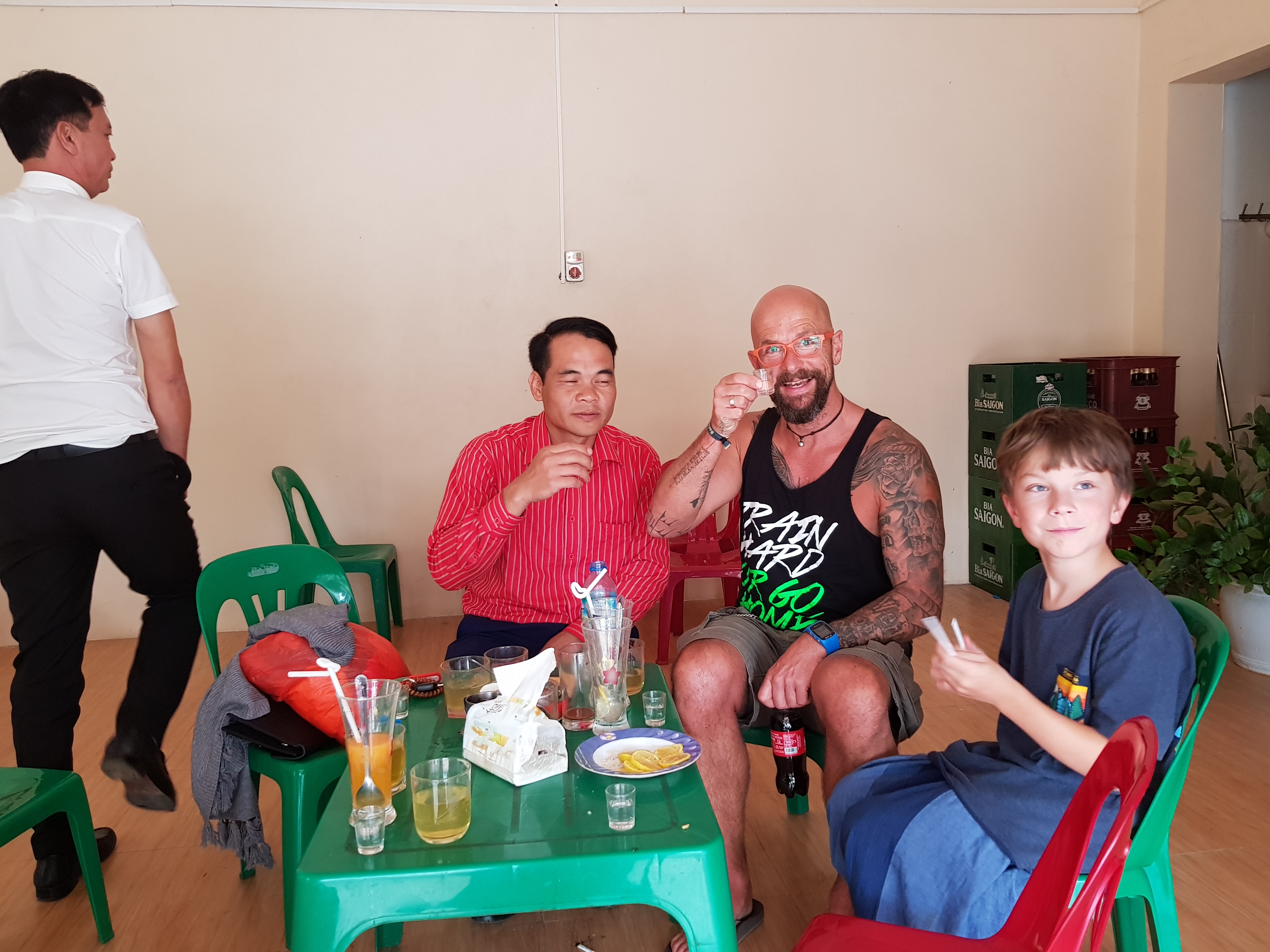 Heute geht es weiter bis nach Cao Bang an der chinesischen Grenze, wo wir morgen zu den Wasserfällen fahren werden. Heute sitzen wir viel im Auto. So viele Kilometer sind es nicht, aber der Verkehr in Vietnam und die Strassenverhältnisse lassen es nicht anders zu. Wir machen für Bela eine Pipi Pause und schwupps, muss Mike Schnaps trinken, weil die Leute dort so selten Touristen sehen…Bela wird auch in 1000 Posen mit den Leuten fotografiert, denn blonde Kinder haben sie noch nie gesehen.
