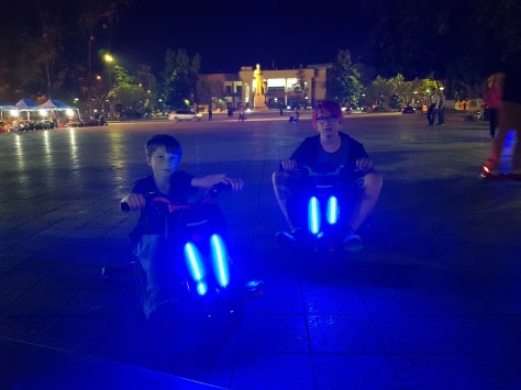 Azul und ich gehen nach dem Essen zum Friseur und lassen Haare waschen. Jürgen schwärmt in den höchsten Tönen. Ich habe eigentlich keine Lust darauf, hatte schon ein paar Bier zuviel, mache aber Azul zuliebe mit. Sie hat Glück und ich jetzt Löcher in der Kopfhaut. Sie wird liebevoll massiert und ich skalpiert. Nach dem Föhnen sehe ich aus wie ein Löwe um die Eier, dafür hat es für uns beide nur 6 Euro gekostet. Vor unserer Eßgarage treffen wir auf ein paar lustige Backpacker aus Bristol. Sie spielen Gitarre und singen und wir machen erstmal alle mit. Das ist klasse. Wir gehen weiter auf einen großen Platz vor der Ho Chi Minh Statue. Dort gibt es leuchtende Karts und andere Fahrzeuge für Kinder. Für die Erwachsenen mehr Bier. Das ist lustig. Levi muss ein paar Mal sein Gefährt tauschen, weil entweder der Akku leer ist oder ein paar Räder abgefallen sind. Wir haben einen wunderschönen Abend. Es ist warm und die Stimmung ist toll.