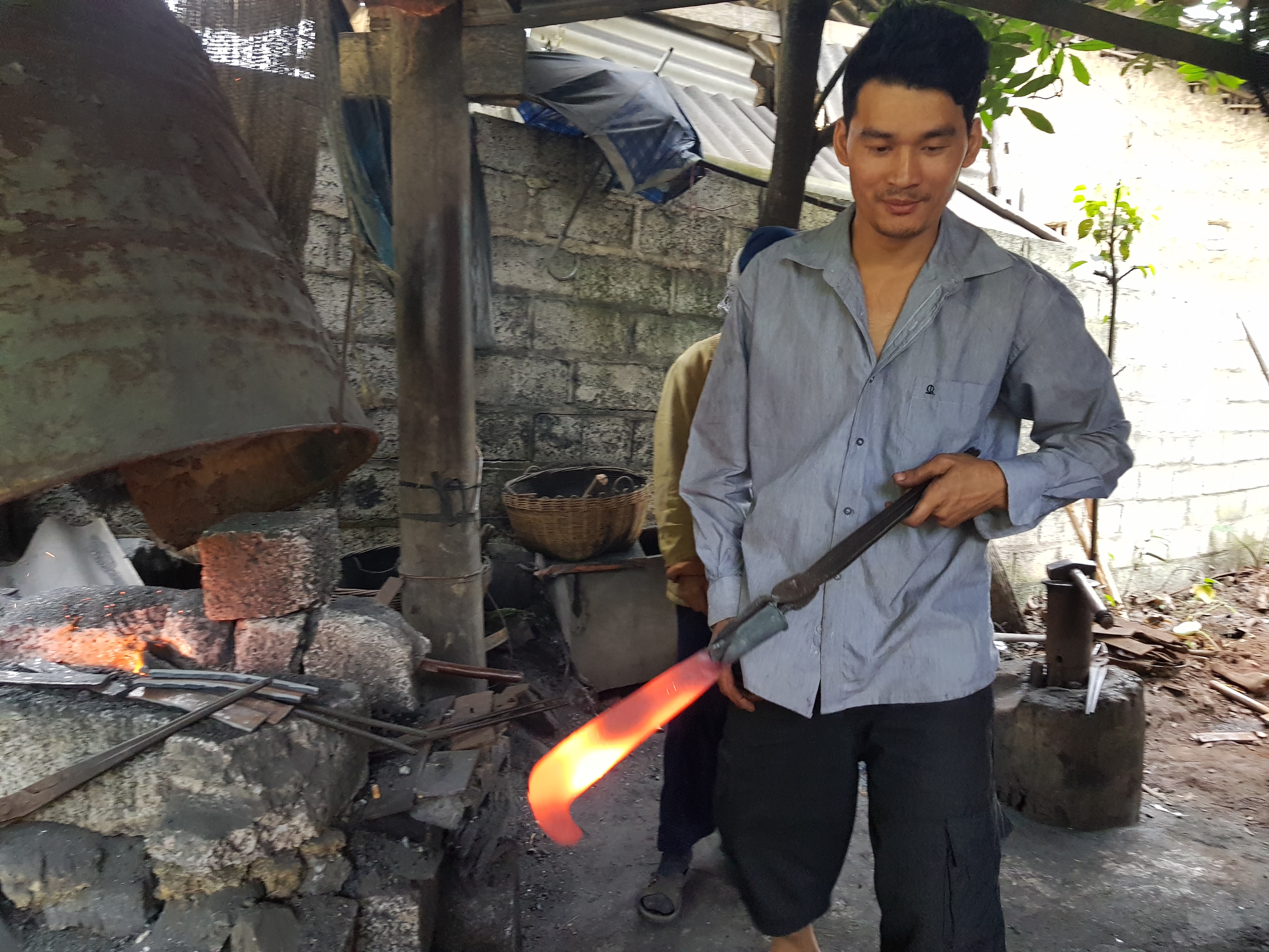 Wasserfall – nächster Morgen. Wir fahren durch die Berge, die Landschaft ist wirklich richtig schön. Wir halten in einem Dorf, in dem Messer hergestellt werden. Das ist schwere Handarbeit. Wir besuchen eine Familie der dortigen Minderheiten. Sie leben in einem relativ großen Haus mit relativ wenig drin. Außer Wind…Sie haben kaum Möbel, die Kleidung hängt auf einer Leine an der Wand und die Wände haben Löcher. Das Dach ist hundert Jahre alt, hält aber noch. Das Baby ist erst vier Wochen alt und trägt keine Windeln. Mit erstaunlich viel Geduld wird es in der Zeit, in der wir dort sind zweimal umgezogen, weil die Hose naß ist. Ich bin natürlich berufsbedingt sehr interessiert am Babygeschehen. Wir können leider meinen Beruf nicht so erklären, dass sie es verstehen, also bin ich Doktor. Jürgen hat in einer tollen Aktion Geld gesammelt, damit sie zur Entbindung ins Krankenhaus gehen kann. Das muss sehr aufregend gewesen sein. Sie ist zum ersten Mal in ihrem Leben mit einem Fahrstuhl gefahren und hatte wohl große Angst. Die größere Tochter ist im Kindergarten, sie haben wir nicht kennengelernt. Die Familie lebt hier mit Oma und Opa, die auch noch Messer zusammen schmieden. Ein Wasserbüffel wohnt im Garten, zum Markt geht es einmal im Monat. Für unsere Kinder ist das alles schwer vorstellbar. Wir kaufen Messer und verabschieden uns.
