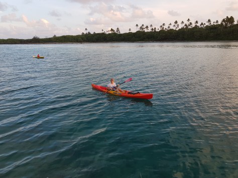 Die Kabinen und das Schiff sind sehr schön, die anderen Passagiere eher wie Altersheim. Aber wird schon… Wir haben Lunch und machen im Anschluß eine Tour zum Fishing Village. Mit Kayaks und Bambusbooten. Es ist interessant. Die Menschen wohnen in Hütten auf dem Wasser und fischen. Leider plant die Regierung sie aufs Festland umzusiedeln. Das würde bedeuten, sie würden arbeitslos auf dem Festland rumhängen. Sie können nichts anderes als fischen, das machen sie seit Generationen so. Ihre Kinder lernen schwimmen, bevor sie laufen können. Nach dem fishing village besuchen wir eine Austernperlenfarm. Ich verliebe mich in eine Kette, möchte die Weltreisekasse dafür opfern und werde beinahe selbst geopfert…Zurück auf dem Schiff chillen wir auf unterschiedliche Art und Weise:
