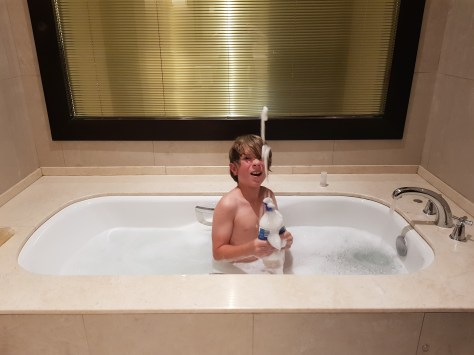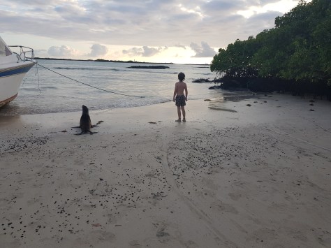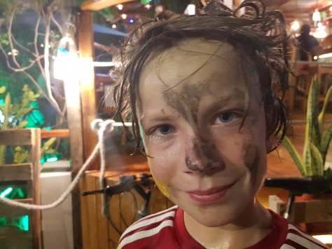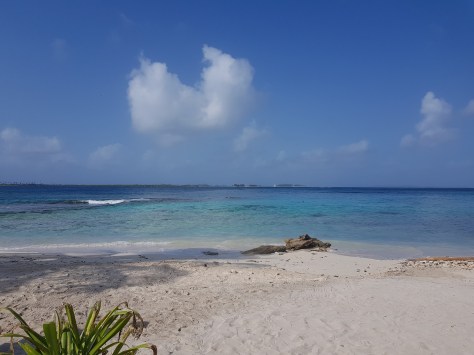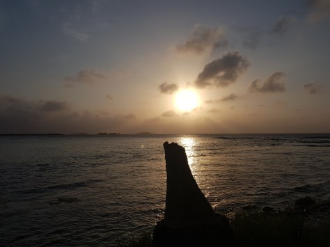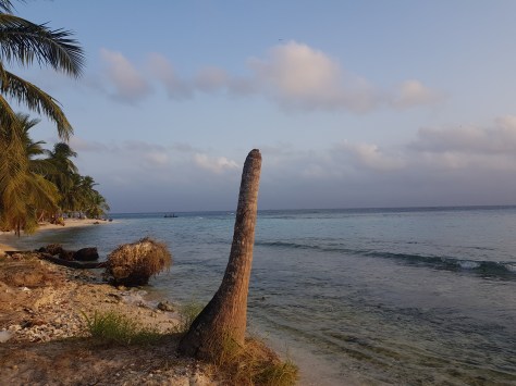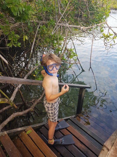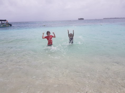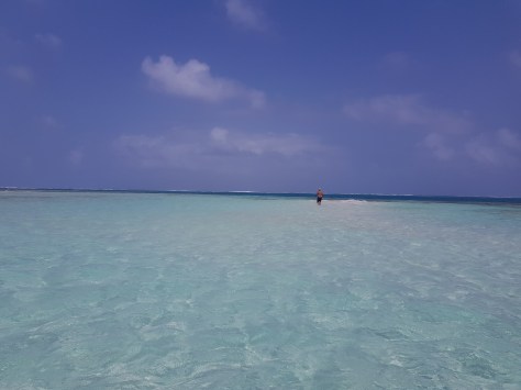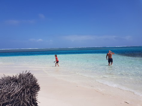 Nach dem Essen machen wir ein unglaublich langes Mittagsschläfchen. Bela, der im Vorfeld meckert, er sei gar nicht müde, ist als erster eingeschlafen. Um 16 Uhr werden wir geweckt, weil die Köchin unsere Abendessenbestellung braucht. Die Auswahl ist immer die gleiche. Bela nimmt diesmal Chicken und ich den ganzen Fisch. Mike bleibt bei Filet. Wir erkunden die Insel. Dafür brauchen wir keine 10 Minuten. Also hängen wir ein bisschen auf unserer Terrasse ab und kümmern uns um den Sonnenuntergang. Gebadet haben wir auch, das Wasser ist superschön.