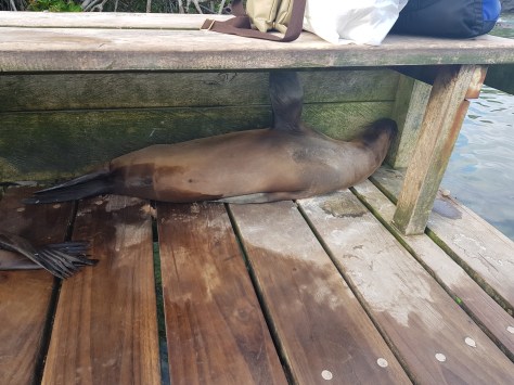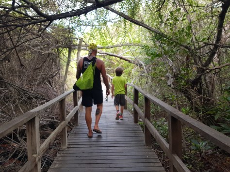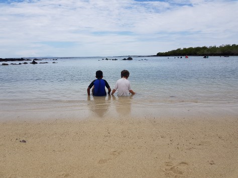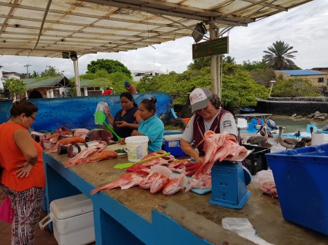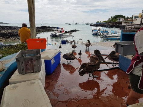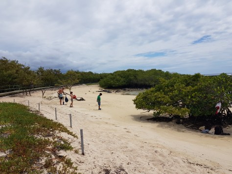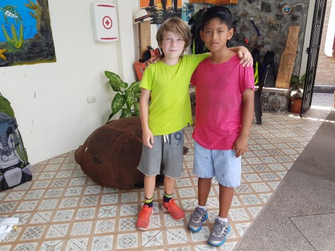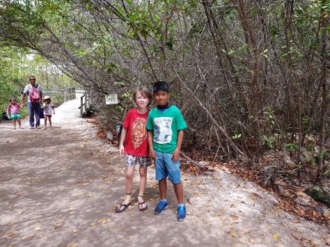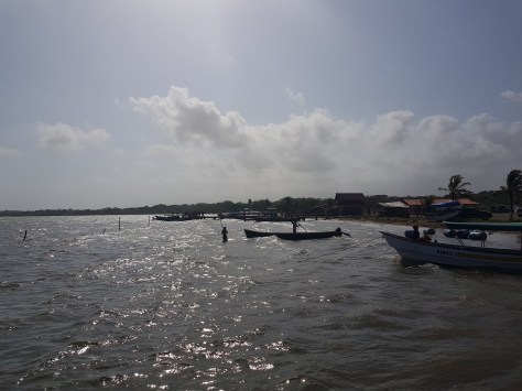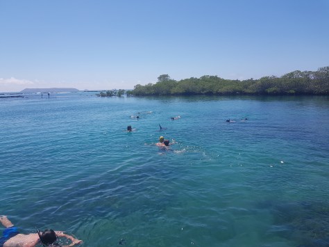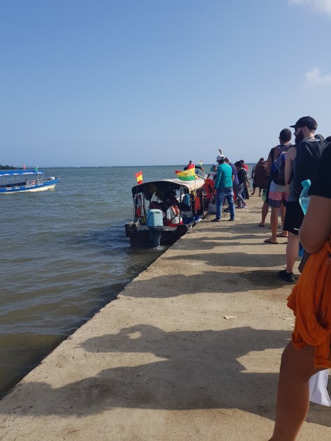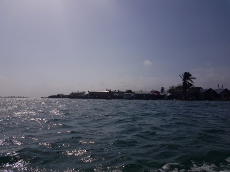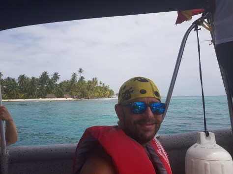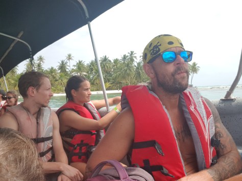Wir sitzen also um 5:15 Uhr abfahrbereit auf der Bank vor dem Hotel. Pünktlich wie die Maurer (haha) mit dem Ticket in der Hand. Wie sich das gehört. Das große Gepäck können wir im Hotel lassen und eine Lunchbox gab es für die Fahrt. So sitzen wir und überlegen ziemlich oft, wann wir anrufen lassen, weil der Fahrer nicht kommt. Deutsche Pünktlichkeit trifft mittelamerikanische…Um 6:15 Uhr geht es dann mal los. Es kommt ein Jeep und wir werden verladen. Mit uns eine dürre amerikanische Touristin auf dem Beifahrersitz. Ein dickes Paar aus Brasilien teilt sich mit Mike die Mitte und Bela und ich haben im Kofferraum schön viel Platz. Nach etwa 15 Minuten Fahrt halten wir an einem Supermarkt. Die brasilianische Frau versorgt sich selber und ihren Mann erstmal mit je 1,5 Litern Cola. Die Amerikanerin kauft Tee. Wir bleiben im Auto. Wir haben gestern schon eingekauft und sind gut ausgestattet mit Snacks und ein bisschen Wasser. Wir bekommen drei Mahlzeiten pro Tag auf der Insel und dazu jeweils ein Dosengetränk. Wasser gibt es immer zum Nachfüllen. Dafür haben wir Flaschen dabei. Und wir können jederzeit für 2 Dollar Cola, Ginger Ale oder auch Bier kaufen. Bela und ich verschlafen die Fahrt. Es geht wohl über Stock und Stein, sagt Mike. Er versucht auch zu schlafen, ist aber leider beschäftigt. Das Dickerchen fällt nämlich ständig mit dem Kopf gegen seine Schulter. Das erinnert mich ein bisschen an unseren Flug in 2013 nach Bangkok, als Levi neben dem dicksten Mann der Welt im Flieger sitzen musste. 10 Stunden. Der Speck, so sagte er damals, kam über die Armlehne zu ihm gekrochen. Dafür hat er aber auch den Tapferkeitspreis bekommen. Wir sind dann doch ziemlich schnell am Hafen und werden nach einem System, was nur die Leute dort verstehen, in die Boote verteilt.