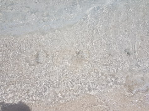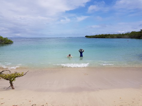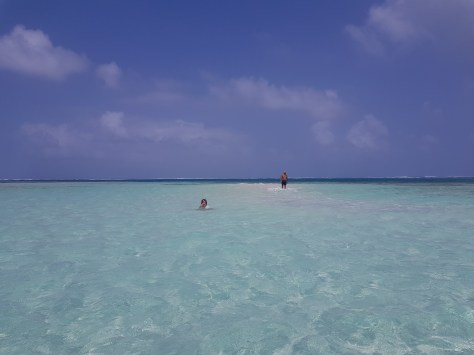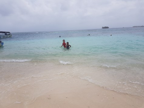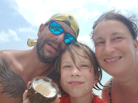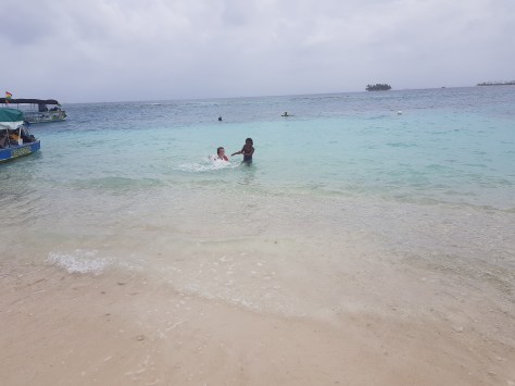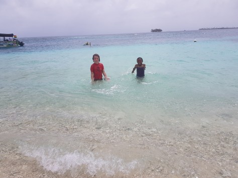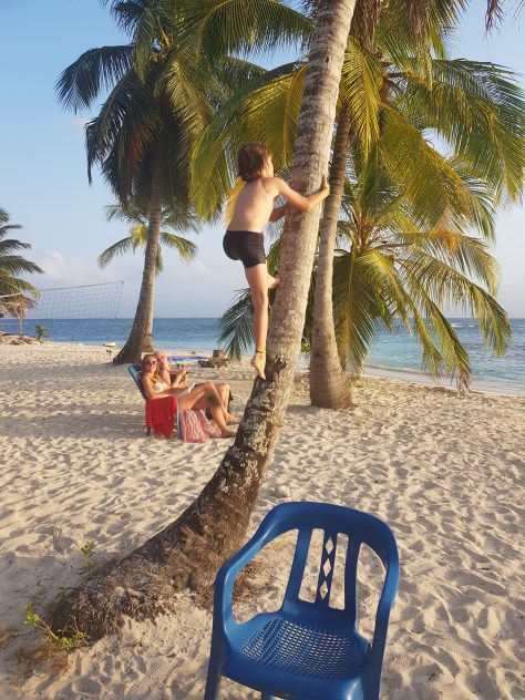 Zurück auf unserer Insel gibt es wieder einfach leckeres Mittagessen und danach ein Schläfchen. Zum einen hat es sich bewährt und zum anderen haben wir nichts zu verpassen. Danach baden wir, trinken Kokosnüsse und freunden uns mit Yuani an. Sie scheint nur darauf gewartet zu haben. Wir bauen erstmal eine Kleckermatschburg und verbuddeln dann Bela im Sand. Zum Abwaschen müssen wir natürlich ins Wasser und während Yuani über den Korallenschrott flitzt, als wäre es nichts, mit einem Kopfsprung im Meer verschwindet, taste ich mich langsam und jammernd über die Steine zum Wasser hin.