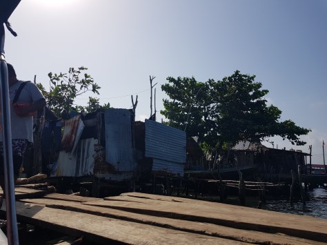 Das Wasser ist trüb, der Hafen dreckig und ich fange an zu zweifeln, ob das alles so richtig war. Für die völlig verdreckte Toilette muss ich einer mürrisch dreinblickenden Guna Frau 25 Cent geben. Das mag ja was werden auf der Insel. Alles basic. Ich denke an unsere Hütte aus Bambus. Die hat keinen Ventilator und natürlich keine Klimaanlage, aber dafür einen Boden aus Sand. Mit Sicherheit werde ich nachts kein Auge zu machen. Na gut, dann ist das halt so. Die Uhrzeit ist schuld, denke ich. Es ist gerade mal 8:30 Uhr, wir haben schon einen Ritt hinter uns und sind müde. Los gehts. Wir halten an einer aus Häusern bestehenden Insel, mit viel Dreck überall und mir rutscht das Herz in die Hose, ich denke:“bitte nicht!!!!“