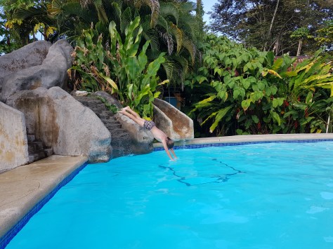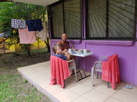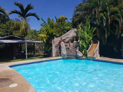 Die Ausreise aus Panama klappt super, wir haben wieder einen netten Beamten, der den Stempel für Bela platzsparend dazwischen quetscht, ebenso bei der Einreise in Costa Rica. Dabei haben wir vorher die übelsten Geschichten über die Laune der Grenzbeamten gelesen. Dass sie viele merkwürdige Fragen stellen, wie z.B. wieso man so viele Stempel im Pass hat und so weiter. Wir wurden nichts dergleichen gefragt, mussten noch nicht einmal ein Ausreiseticket zeigen oder sagen, wie lange wir bleiben werden. Alles entspannt. Unser Shuttlebusfahrer ist eine faule unfreundliche Person, er ist aber auch der einzige unfreundliche Mensch, den wir in Costa Rica treffen. Alle anderen sind sehr nett, wobei wir es überwiegend mit ausgewanderten Europäern zu tun haben. Wir fahren nach Puerto Viejo. Dort habe ich ein kleines Hotel gebucht, was sogar eine Wasserrutschte hat. Pool und Garten sind wirklich sehr schön, die französische Besitzerin ist sehr nett, aber die Bungalows sind weniger als basic.