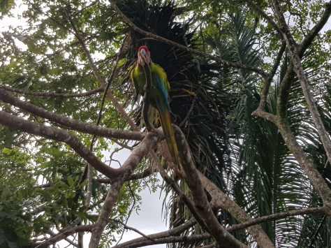 Puerto Viejo ist ein typisches Touristenörtchen mit vielen Souvenirshops und Restaurants. Wir wohnen etwas außerhalb des Zentrums. Ein paar Ausgehmöglichkeiten gibt es aber auch in unserer Nähe. So waren Bela und ich am ersten Abend nochmal mit Taschenlampe unterwegs und haben einen Shake getrunken. Eine Schlange haben wir zum Glück nicht gesehen. Es gibt hier in Costa Rica sehr viele Schlangen. 145 verschiedene Arten, viele sehr giftig. Deshalb ist es wichtig mit Lampe rauszugehen, wenn es dunkel ist. Wir lassen es gechillt angehen. Lesen viel, chillen am Pool, gehen zum Strand. Wir besuchen ein Ara-Rettungszentrum. Das ist wunderschön. Leider ist der Volunteer, der die Führung macht, eine Schnarchnase und gestaltet es ziemlich langweilig. Aber die Papageien sind wunderschön.