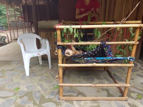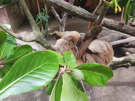 Irgendwie ist die Luft ein wenig raus. Bela und ich fühlen uns nicht so wohl im Hotel. Wir reden mit Charlene, sie ist so nett und lässt uns ohne Kosten vorzeitig auschecken. Das heißt, wir bleiben eine weitere Nacht und ziehen dann um. Wir besuchen aber vorher noch ein Jaguar-Rettungszentrum, das ein absolutes Highlight ist. Wir dürfen das Gepäck im Hotel lassen und gehen zur Führung um 11:30 Uhr. Wir haben Glück, es gibt eine auf Deutsch. Das ist für Bela immer noch etwas interessanter. Im Rettungszentrum werden verletzte oder kranke Tiere aufgepäppelt und in den meisten Fällen wieder ausgewildert. Luis, ein Volunteer aus Hamburg, macht das super. Er erzählt interessante Dinge über die Tiere und die Arbeit im Zentrum. Eigentlich wollte er nur einen Monat bleiben, das war vor einem halben Jahr. Wir sehen viele Faultiere und erfahren Dinge, die wir vorher nicht wussten. Den Unterschied zwischen einem 2 und 3 Finger Faultier etwa, oder, dass sie 12 Stunden ruhen, 8 Stunden schlafen und sich nur 4 Stunden langsam bewegen und essen. Nur Blätter, deshalb haben sie nicht so viel Energie. Sie nehmen pro Tag etwa 170 Kalorien zu sich, damit müssen sie haushalten. Wir sehen viele Babyfaultiere, die sind wirklich extrem süß. Sie kommen ins Zentrum, weil sie zum Beispiel von der Mutter abgefallen und vom Baum runtergeplumpst sind. Bis die Mutter dann runtergeklettert ist, um es zurück zu holen, vergeht natürlich sehr viel Zeit. Oft wird es dann vorher gefunden und abgegeben.